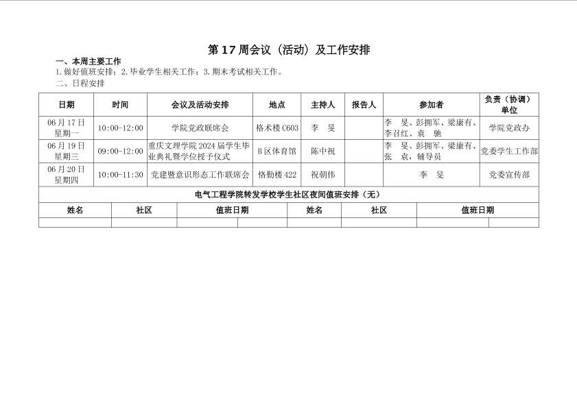 第17周会议(活动)及工作安排