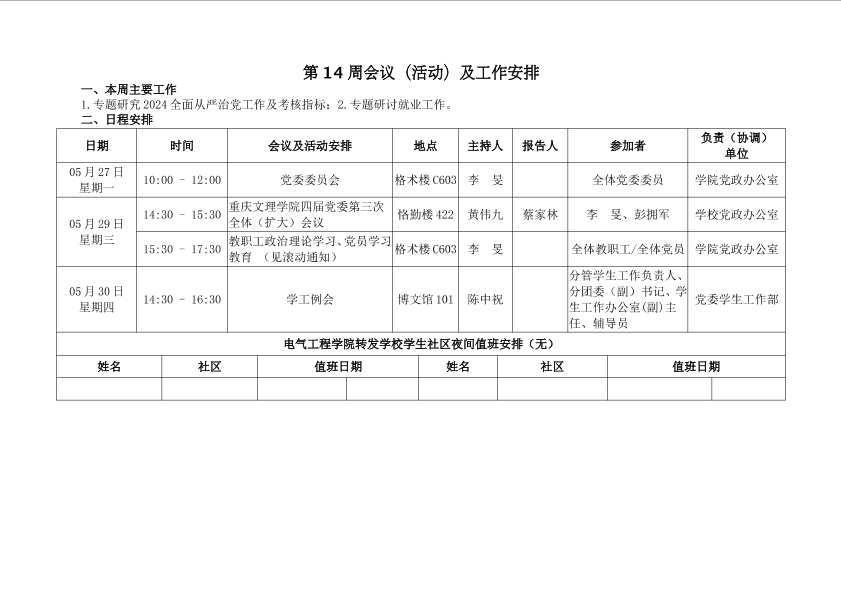 第14周会议(活动)及工作安排